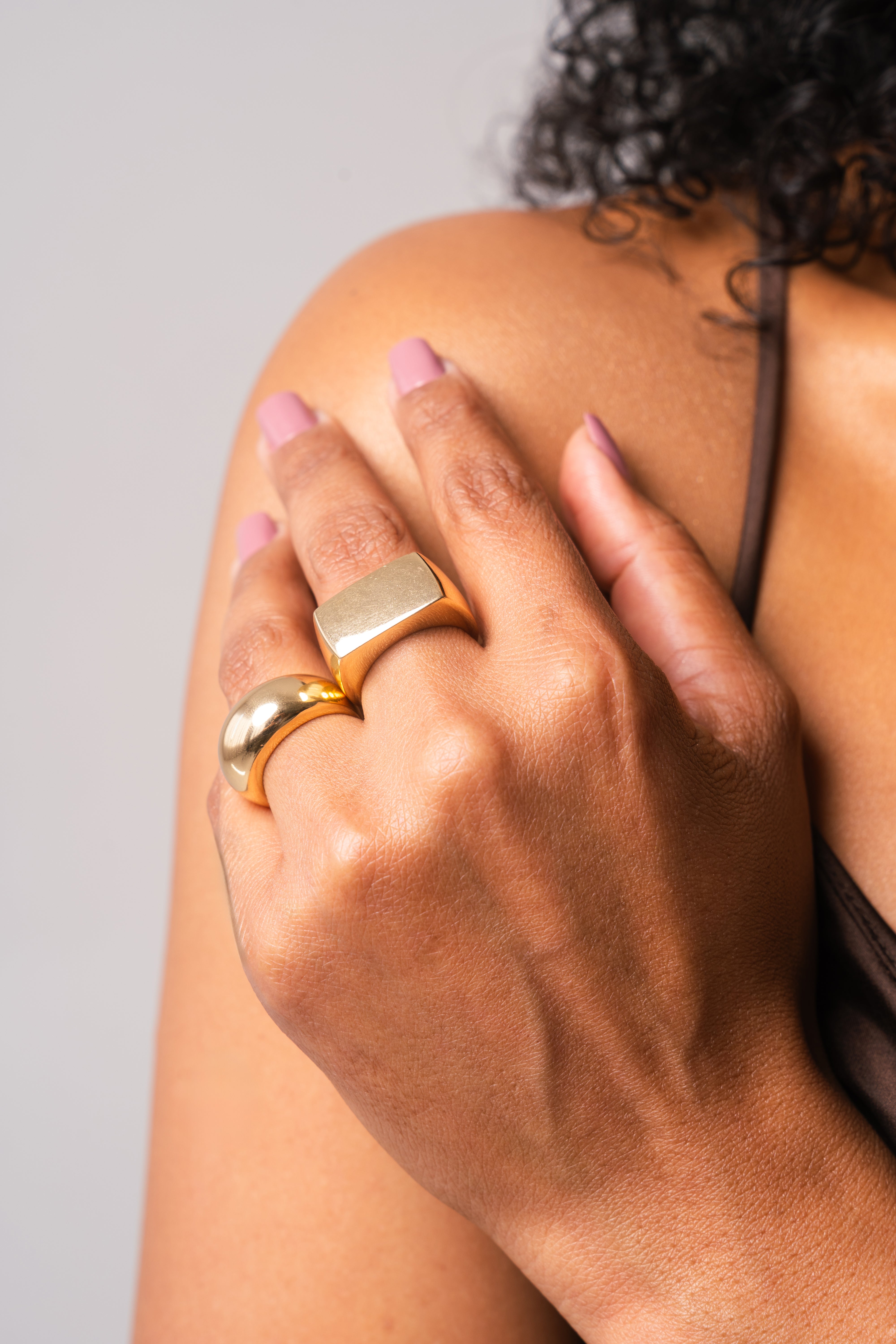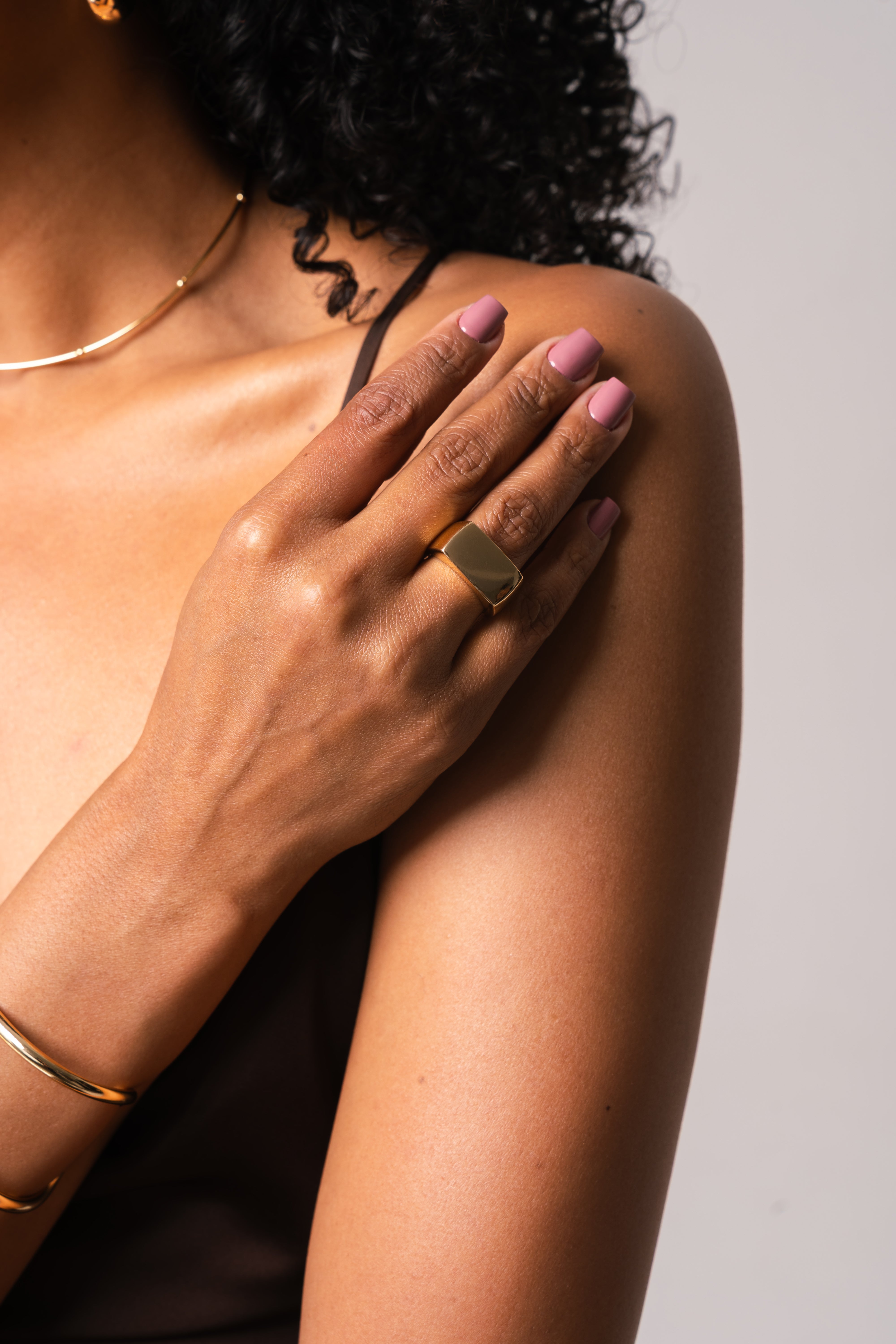 Seu brilho em banho de ouro 18k transmite presença e leveza na medida certa, ideal para quem busca uma peça moderna e atemporal. Com aproximadamente 2,7 cm, o anel se destaca como um clássico reinventado, perfeito para mulheres de estilo refinado e olhar apurado.