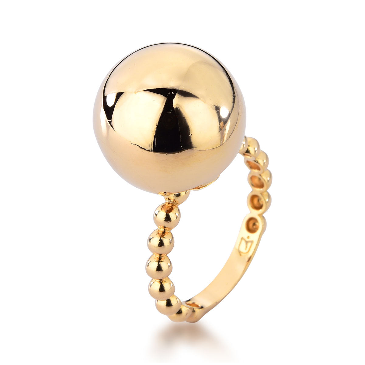 Design escultural que une ousadia e sofisticação. O Anel Larissa traz como destaque a esfera dourada de 16mm, criando uma peça impactante que transmite força e personalidade em cada detalhe.