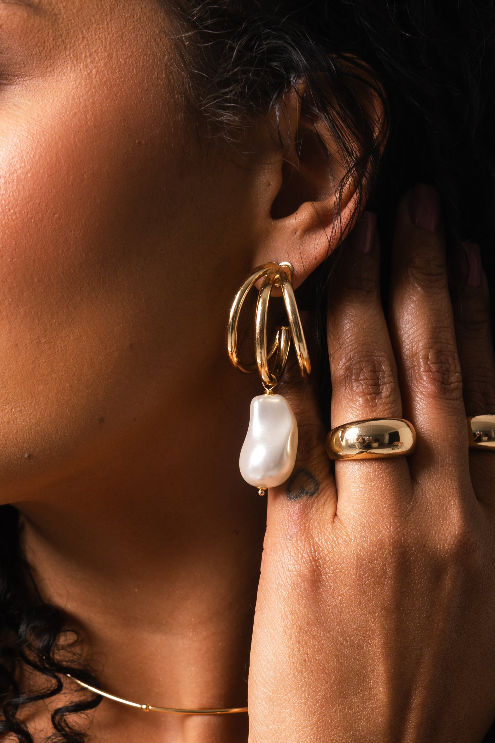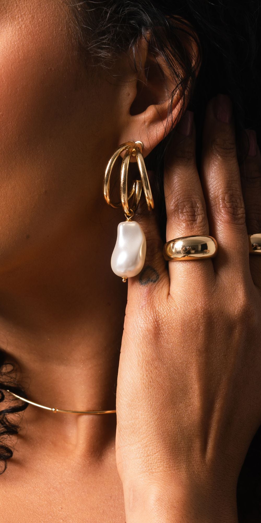 O Brinco Aura traduz a elegância em sua forma mais contemporânea. Seu design em argola maxi com pingente de pérola une o charme atemporal das pérolas à ousadia de uma peça moderna e marcante.