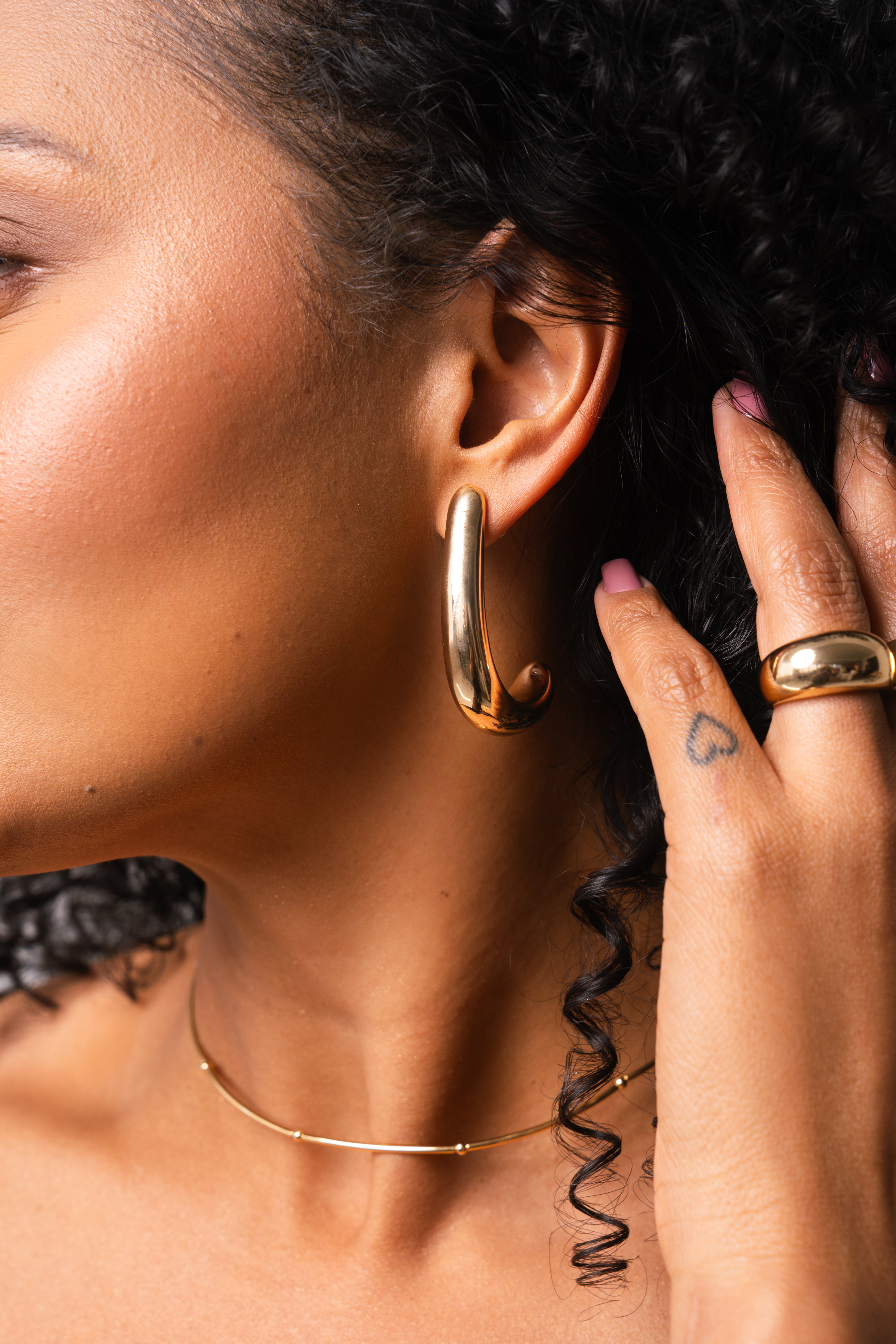 Seu formato alongado de 5 cm cria uma silhueta elegante, que valoriza o rosto e confere presença sem exageros. Uma peça versátil, ideal para quem busca sofisticação com um toque de estilo urbano e atual.