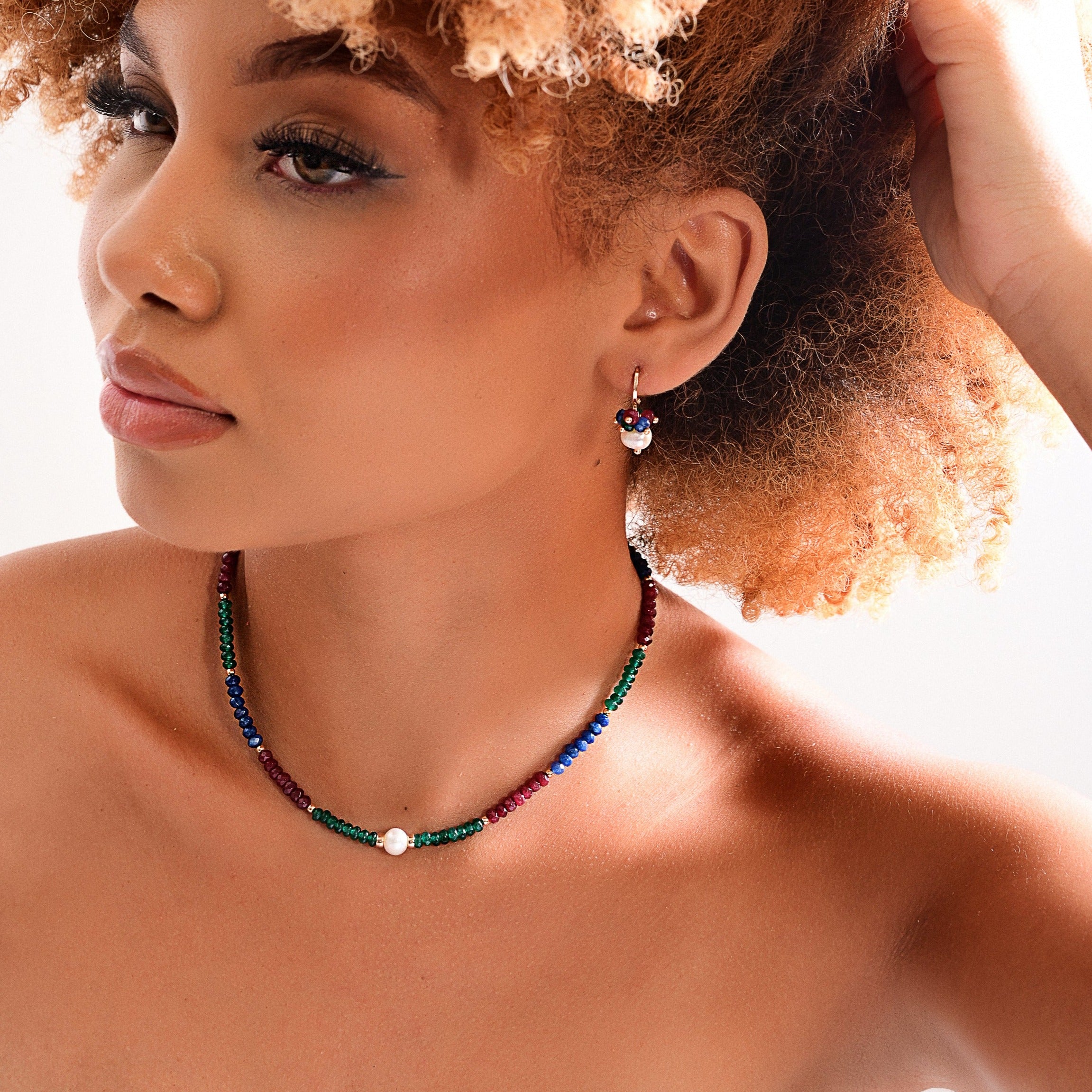 Elegância vibrante define o Colar Elisa. Um mix de pedras naturais em jade rubi, safira e esmeralda cria uma harmonia sofisticada de cores, que ilumina qualquer produção com personalidade única.