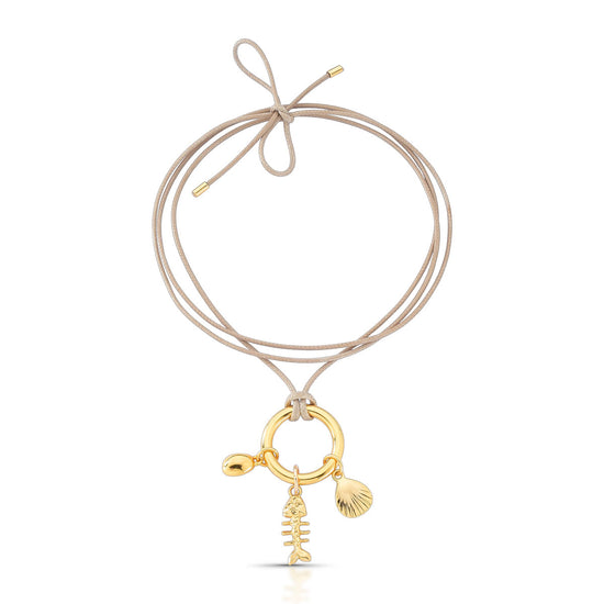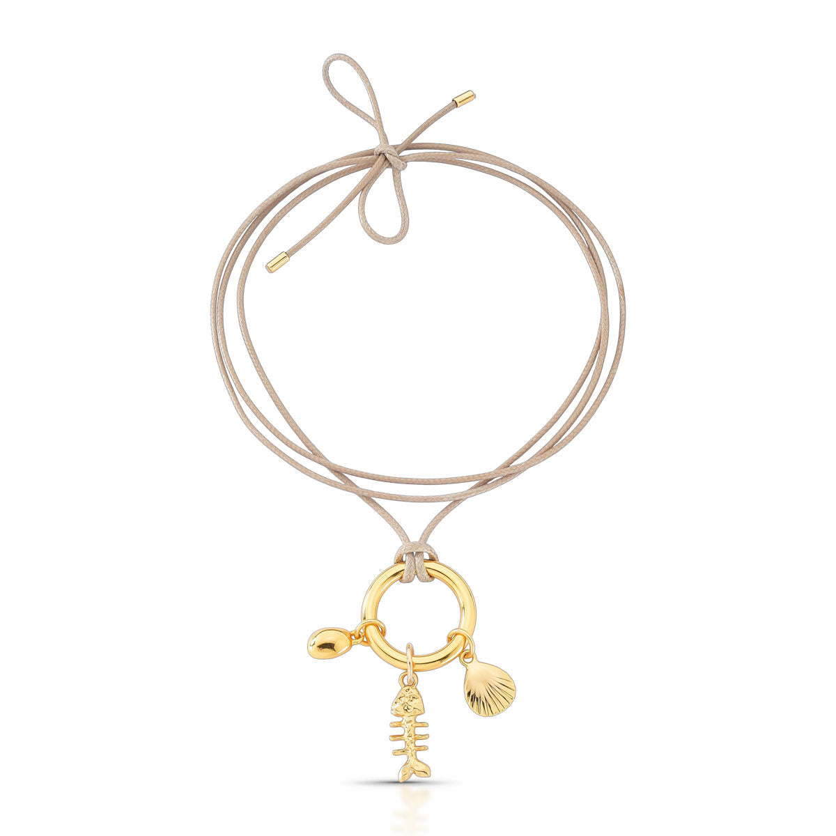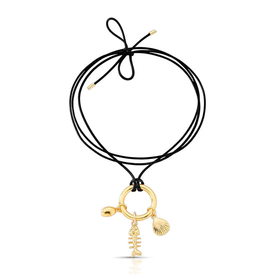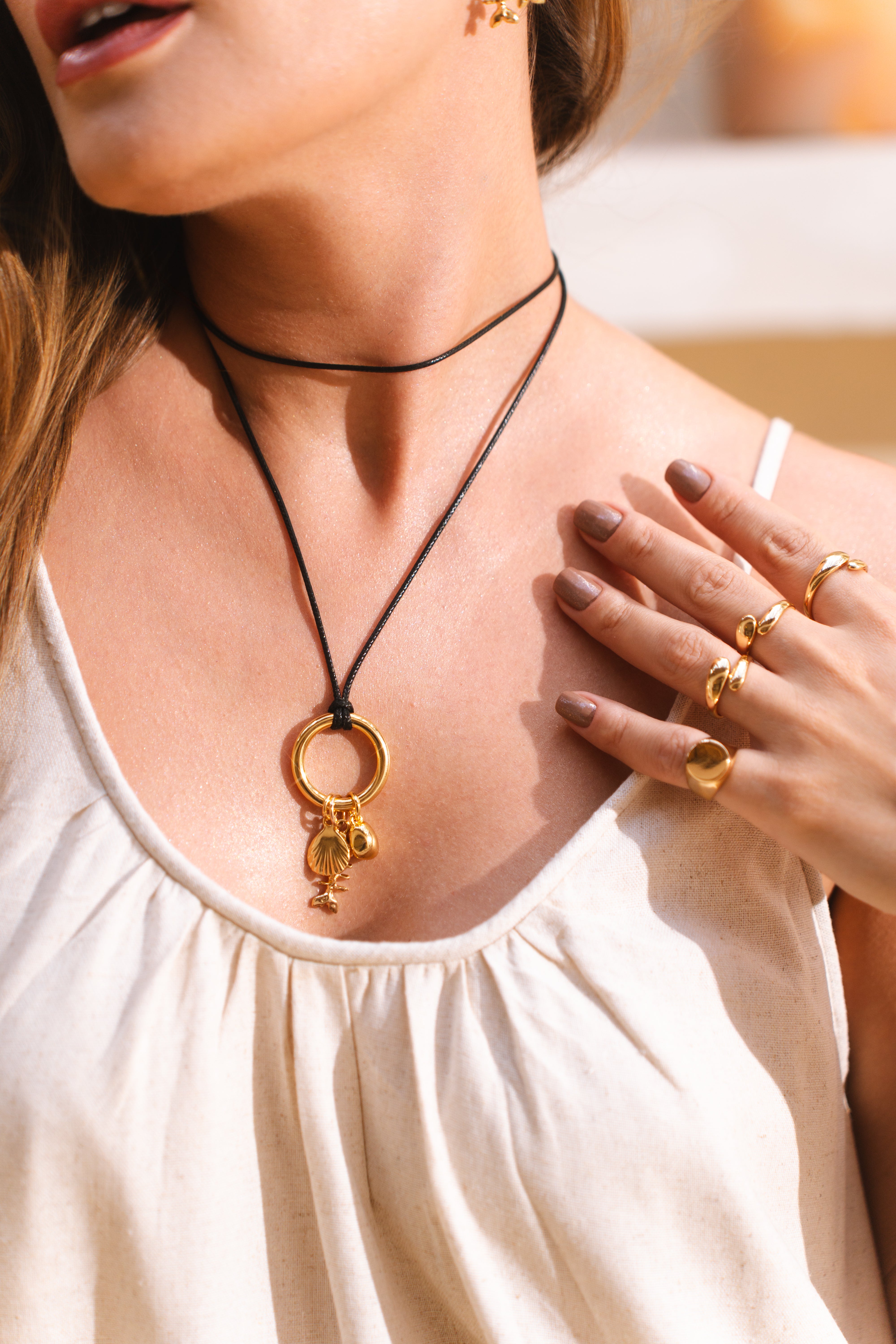 O Colar Eva é a expressão do estilo contemporâneo com um toque artesanal e elegante. Seu design une o couro fake macio a pingentes banhados a ouro 18k em formato de peixe, gota e concha — símbolos que evocam leveza, sorte e energia natural.