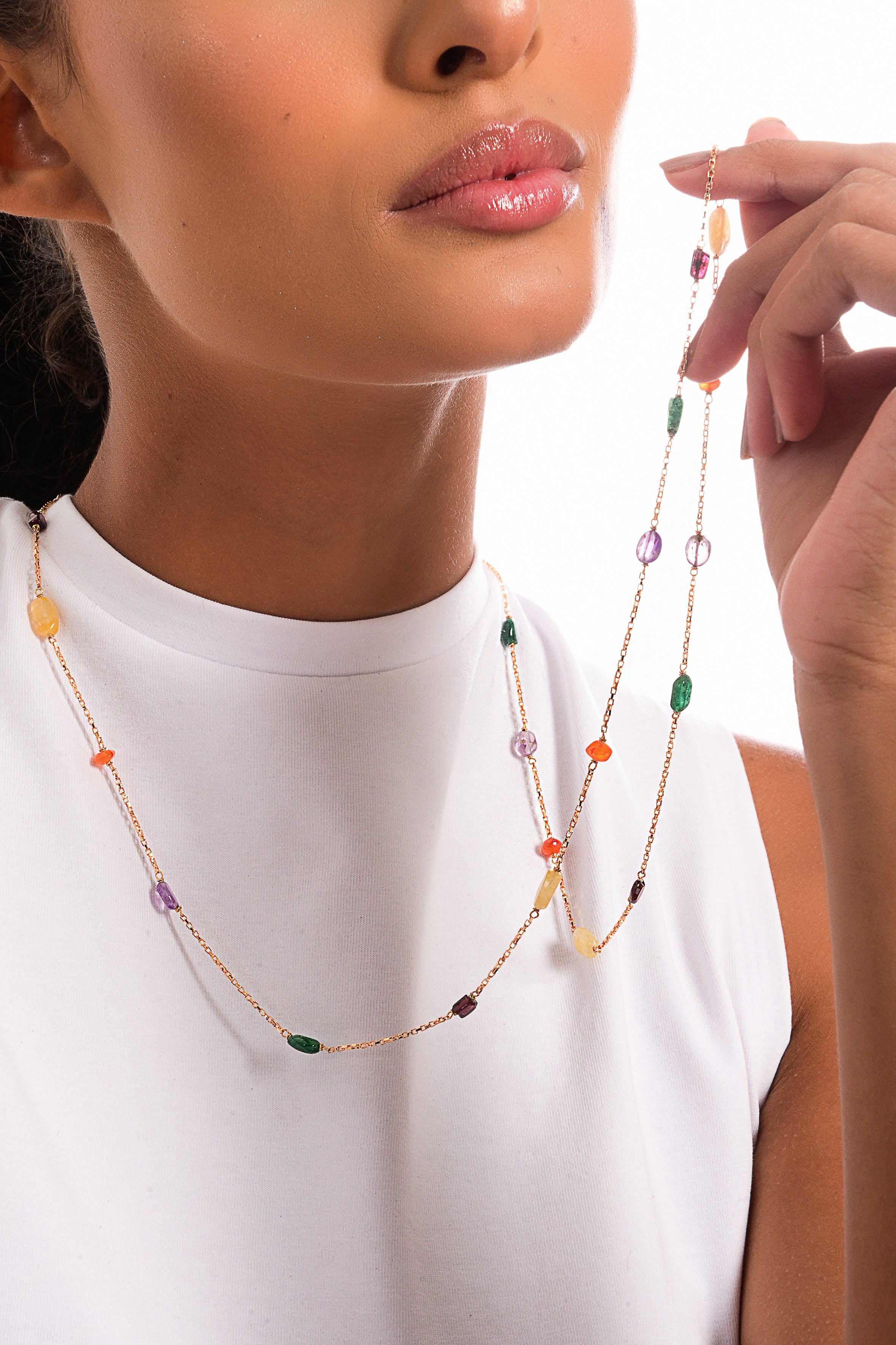 Deslumbre-se com a elegância exclusiva do Colar Hermione. Uma peça deslumbrante com corrente delicada e pedras jade com formas e cores distintas. Sinta-se luxuosa e sofisticada ao usar esse colar versátil que irá complementar qualquer look com uma aura de requinte e refinamento