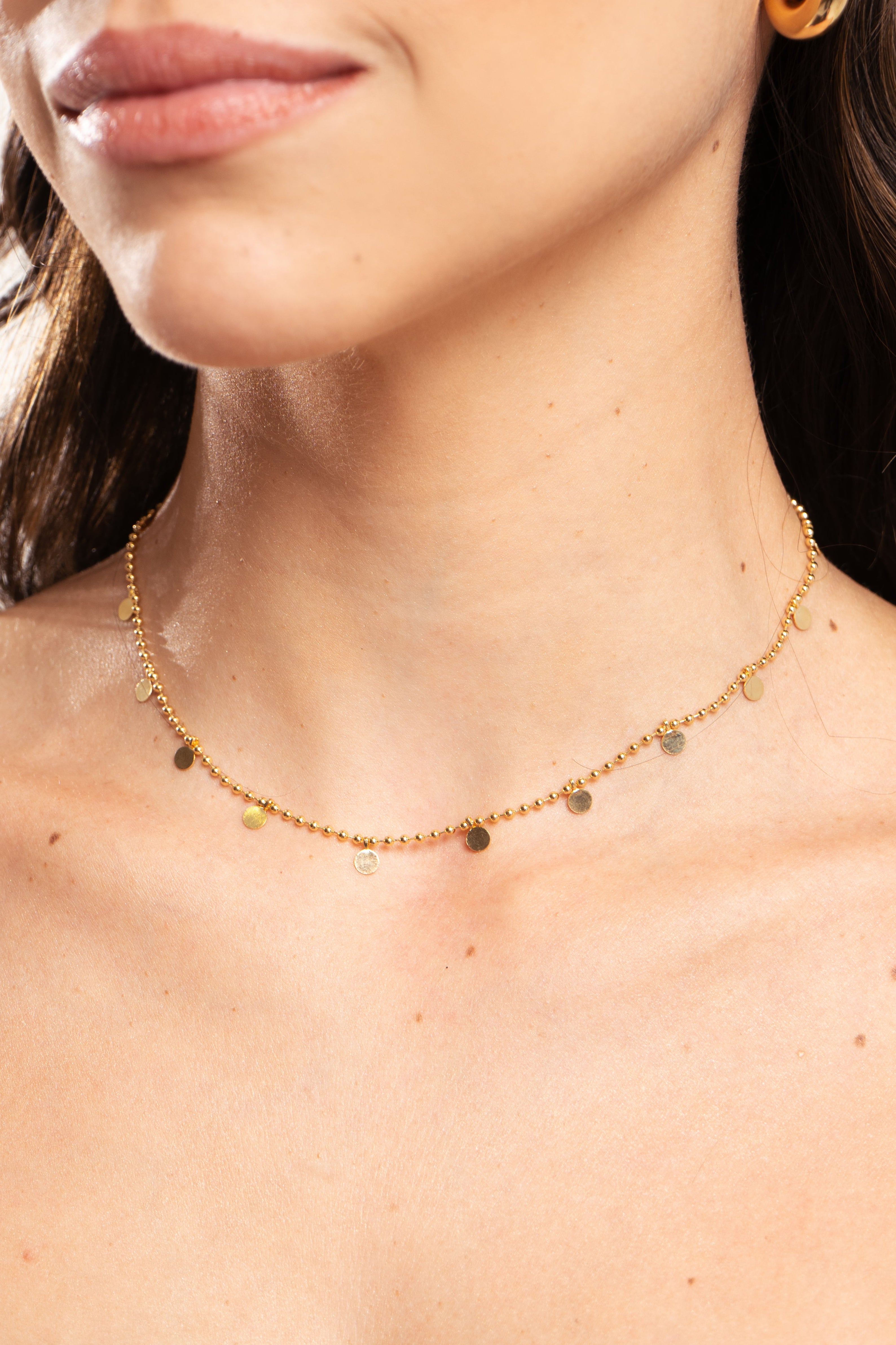 O Colar Maju reflete a essência da elegância contemporânea. Com design leve e delicado, ele é composto por uma corrente curta adornada por pequenas medalhinhas, criando um movimento sutil e um brilho sofisticado que valoriza o colo com naturalidade.