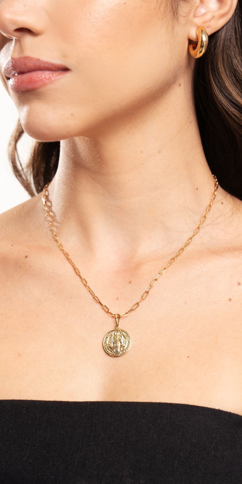 Estética atemporal com significado especial define o Colar Rosi. A corrente delicada recebe a medalha de São Bento como ponto de destaque, criando uma joia que une elegância, simbologia e estilo contemporâneo.