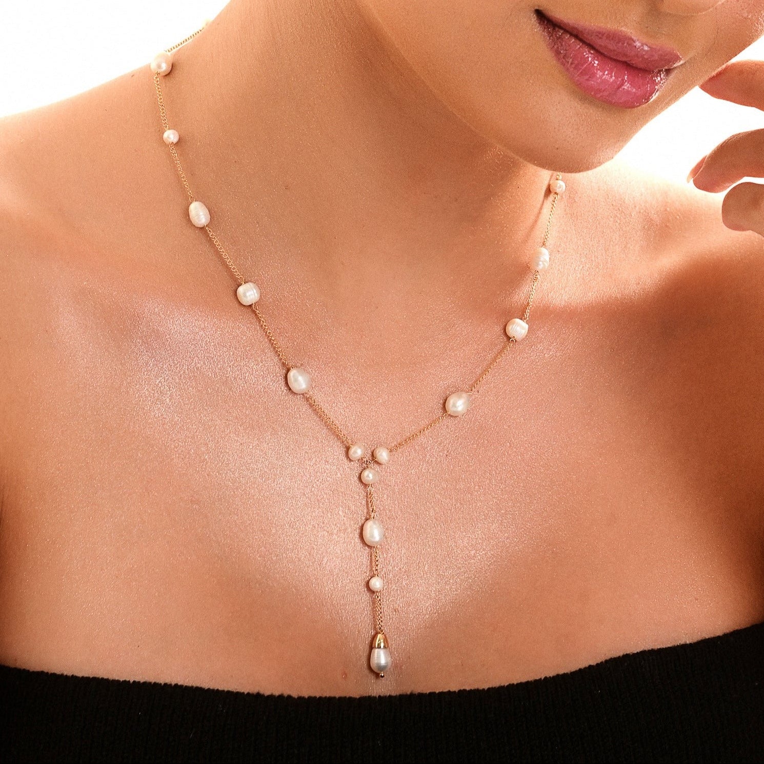 O Colar Teresa une romantismo e elegância em um design atemporal. Seu estilo gravatinha valoriza o colo com sutileza e movimento, enquanto as pérolas de água doce trazem uma aura de pureza e feminilidade inconfundível.