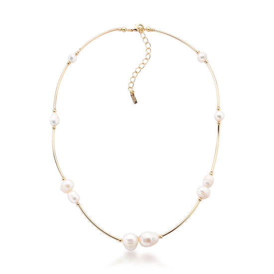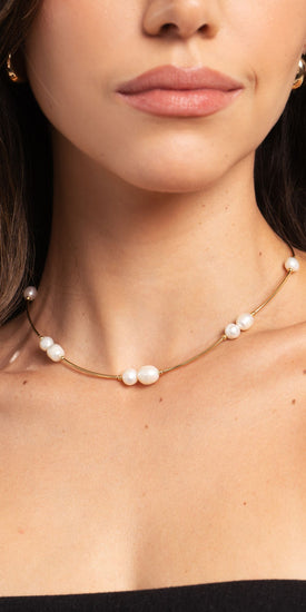 Elegância moderna em uma composição que une a delicadeza das pérolas de água doce ao design contemporâneo dos tubos metálicos. Um colar que traduz personalidade e leveza, pensado para mulheres que apreciam sofisticação sem abrir mão de autenticidade.