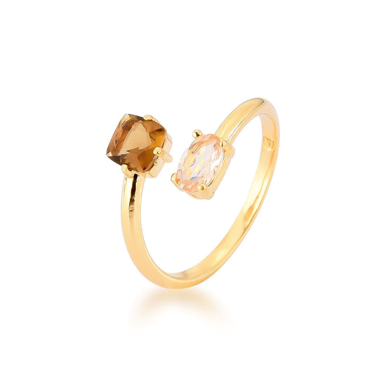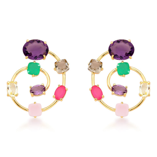 Conjunto Maya Brincos e Anel de Cristais Coloridos Banho de Ouro 18k