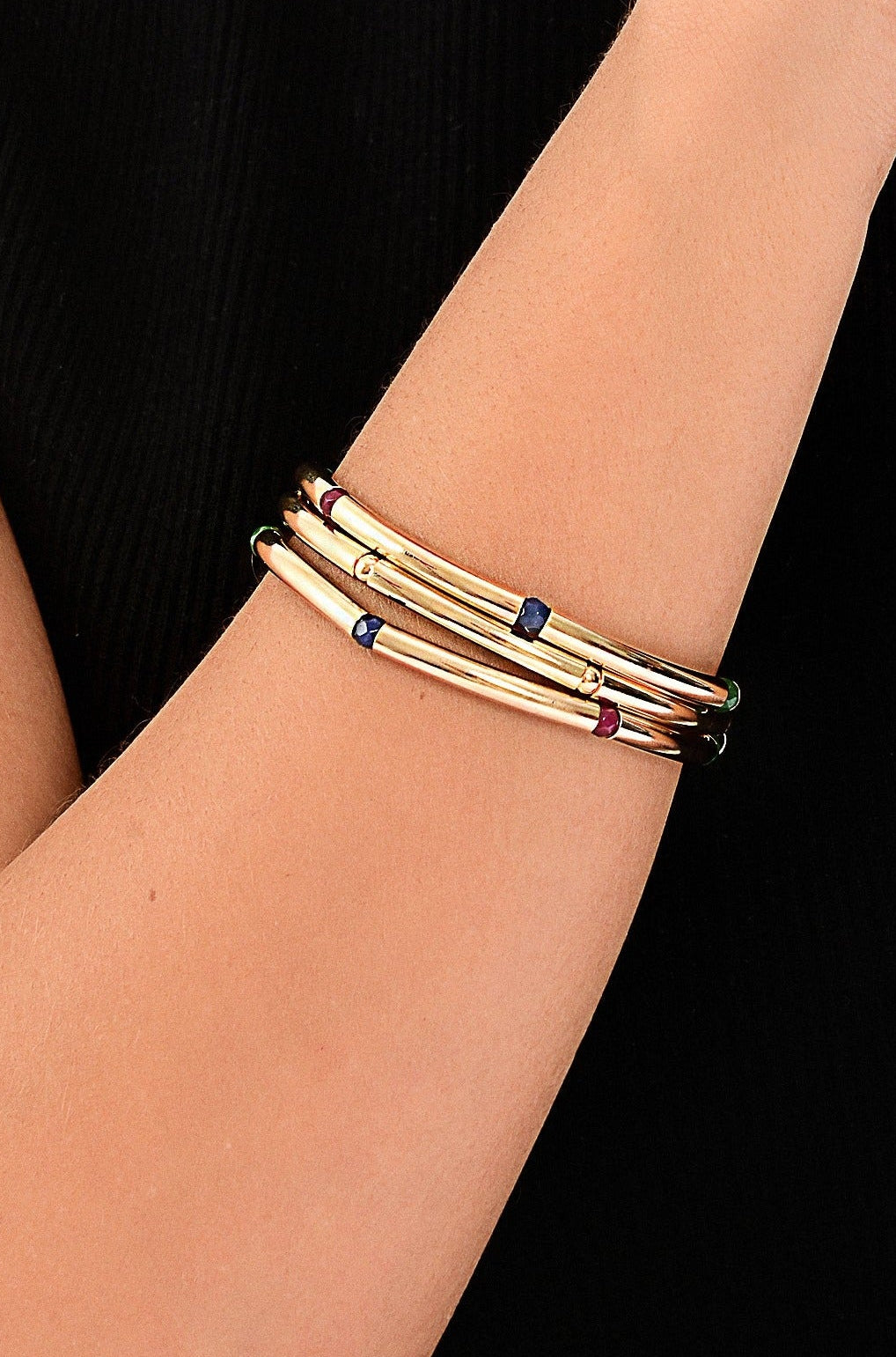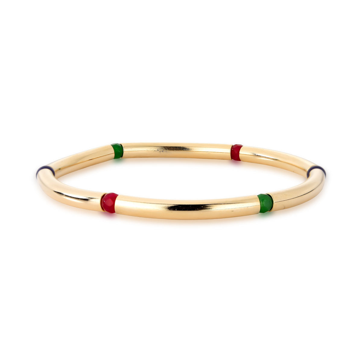 A Pulseira Juliana reflete a harmonia perfeita entre cor, leveza e sofisticação. Feita com tubos metálicos e pedras jade coloridas, a peça traz um toque vibrante e contemporâneo, mantendo o equilíbrio entre elegância e modernidade.